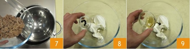 geben Sie sie in ein Wasserbad 7, bis sie vollständig geschmolzen ist. In einer separaten Schüssel geben Sie den Mascarpone, aromatisieren Sie ihn mit den aus der Vanilleschote extrahierten Samen 8 und dem Rum 9 und mischen Sie mit einem Spatel, um alles zu vermengen.