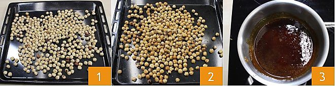 Um die Pralinen vorzubereiten, beginnt damit, die Haselnüsse zu rösten. Gebt sie auf ein Backblech 1 in den bereits vorgeheizten Ofen bei 150°C für 35 Minuten, bis sie gut goldbraun sind 2. In der Zwischenzeit bereitet das Karamell vor (Karamellfindet ihr weitere Informationen): In einem Edelstahltopf mit doppeltem Boden fügt den Kristallzucker löffelweise hinzu und lasst ihn bei geringer Hitze langsam schmelzen, ohne zu rühren, sondern den Topf vorsichtig zu schwenken. Ihr müsst ein braunes Karamell erhalten 3, dessen Temperatur zwischen 166°C-175°C schwanken sollte (nutzt ein Lebensmittelthermometer als Hilfe).