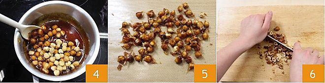 Fügt dem Karamell die Hälfte der gerösteten Haselnüsse hinzu und mischt sehr schnell 4. Legt alles auf eine Silikonmatte und trennt die Haselnüsse voneinander 5. Helft euch mit einem Holzstäbchen, um euch nicht die Hände zu verbrennen. Dies muss schnell geschehen, sonst lassen sich die Haselnüsse nicht mehr trennen. Sobald sie abgekühlt sind, hackt sowohl die gerösteten als auch die karamellisierten Haselnüsse mit einem Küchenmesser 6 oder, wenn ihr es bevorzugt, mit einem Mixer (je nachdem, ob ihr größere oder kleinere Haselnussstücke haben möchtet).