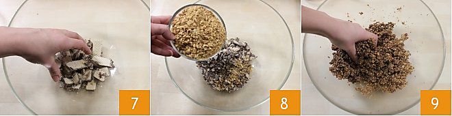 Jetzt vervollständigt die Füllung, die in den Pralinen sein wird: Zerbröselt in einer Schüssel die Waffeln grob mit den Händen 7 und fügt die gehackten Haselnüsse hinzu 8. Mischt ein wenig mit den Händen, sodass die Waffelcreme etwas schmilzt und die Zutaten sich miteinander verbinden 9.