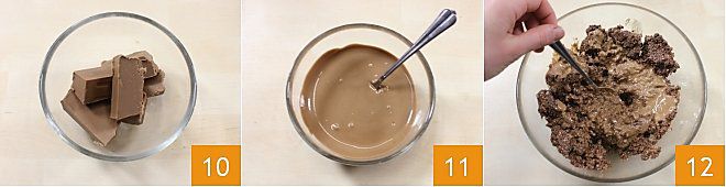 Schmelzt die Giandujaschokolade in der Mikrowelle oder im Wasserbad (10-11) und fügt sie der Mischung aus Waffeln und Haselnüssen hinzu. Gut mischen 12: Die Füllung der Pralinen sollte weich und kompakt sein.