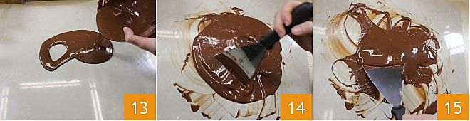 Nun schmelzt die Zartbitterschokolade. Damit die Pralinen schön glänzen und nicht matt und weißlich werden, muss die Schokolade temperiert werden, d.h. sie darf nie über 31°C steigen: so erhaltet ihr glänzende Pralinen, die länger haltbar sind. Um diesen Vorgang auszuführen, gibt es zwei Möglichkeiten: Entweder schmelzt ihr die Schokolade im Wasserbad und, ausgestattet mit einem Thermometer, rührt kontinuierlich, bis sie geschmolzen ist und die erforderliche Temperatur behält. Wenn ihr über 31°C kommt, müsst ihr die Schokolade auf maximal 45°C bis 50°C bringen, und wenn sie die Temperatur erreicht hat, gießt 2/3 davon auf eine Marmorplatte (es ist nicht möglich, dies auf anderen Oberflächen zu tun) 13 und bewegt sie schnell mit einer Spachtel (14-15), indem ihr sie kontinuierlich umrührt, bis sie 29°C erreicht hat. Dann gießt sie in die Schüssel mit der restlichen Schokolade und mischt kontinuierlich, bis sie 31°C erreicht hat.