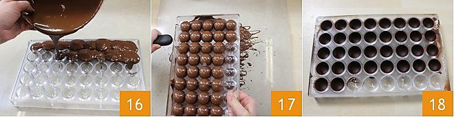 Nehmt nun eine Polycarbonat-Form für Pralinen und gießt reichlich geschmolzene Schokolade hinein 16, dreht die Form um und klopft sie auf die Seite, damit die überschüssige Schokolade vollständig abfließt 17. Entfernt die überschüssige Schokolade mit Hilfe einer Spachtel; führt diesen Vorgang, der dazu dient, die Hülle der Praline zu schaffen, also die äußere Struktur, auf einem Tablett aus, um die abfließende Schokolade aufzufangen. Lasst sie schnell für ein paar Stunden abkühlen, bis sich kleine weiße Bläschen unterhalb gebildet haben 18.