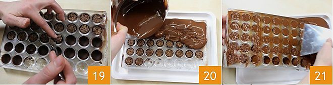 Füllt die entstandenen Hüllen mit einem Teelöffel der Füllung 19, achtet darauf, nicht bis zum Rand zu gelangen, sondern lasst 2-3 Millimeter Platz. Schmelzt erneut die Schokolade und führt die Temperierung erneut aus, und wenn sie 31°C erreicht hat, gießt sie über die Pralinen 20, um den Boden zu erzeugen, und entfernt die überschüssige Schokolade mit einer Spachtel 21.
