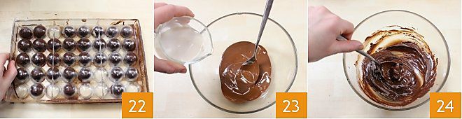 Lasst die Pralinen ein paar Stunden abkühlen. Wenn sie gut hart sind, nehmt sie aus der Form: Klopft die Form vorsichtig auf eine flache Oberfläche 22 und sie werden sich lösen. Legt sie auf ein Tablett oder eine Servierplatte und bereitet die Ganache für die Dekoration vor: Schmelzt die Schokolade, fügt die Sahne hinzu 23 und mischt, um sie zu verbinden 24. Übertragt die Ganache in einen Spritzbeutel mit einer schmalen Sterntülle.