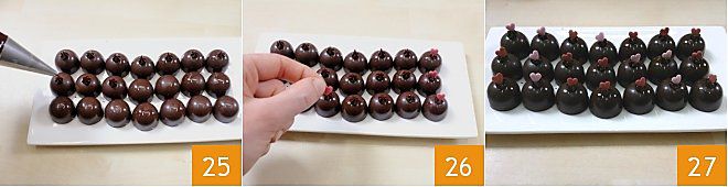 Verziert jede Praline mit einem kleinen Tupfer Ganache auf der Oberfläche 25 und einem Zuckerherz obendrauf 26. Hier habt ihr es: Die Pralinen sind fertig 27, sie werden schnell weg sein!