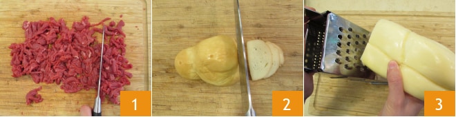 Um die Cistecca Montese zuzubereiten, beginnen Sie mit den Auberginen, reinigen und würfeln Sie sie. Gehen Sie sofort zum Fleisch über, es muss in sehr kleine Würfel geschnitten werden 1. Schneiden Sie den geräucherten Scamorza dünn 2 und reiben Sie den Provolone 3.