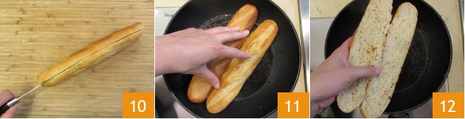 Teilen Sie in der Zwischenzeit die Baguettes der Länge nach in zwei Hälften 10 und rösten Sie sie kurz in der Pfanne, in der die Auberginen gekocht wurden, wobei Sie darauf achten, dass das Innere des Brotes mit der Pfanne in Kontakt kommt 11. Wenn die Krume etwas Farbe angenommen hat, nehmen Sie das Brot heraus 12.