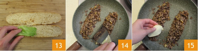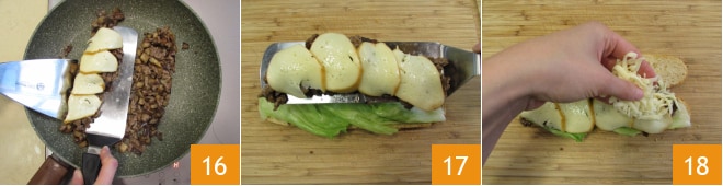 In wenigen Augenblicken wird er geschmolzen sein, dann die Hitze ausschalten und die Füllung mit einem Spatel anheben 16 und direkt auf den Boden des Baguettes legen 17. Fügen Sie oben den geriebenen Caciocavallo hinzu 18.