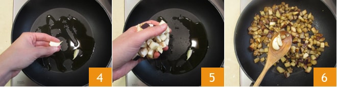 Gehen Sie zum Herd. In einer Pfanne braten Sie den halbierten Knoblauch in etwas Öl an 4. Fügen Sie die Auberginen hinzu 5 und braten Sie sie unter gelegentlichem Rühren. Wenn sie weich sind, entfernen Sie den Knoblauch 6 und würzen Sie nach Belieben mit Salz und Pfeffer und stellen Sie sie beiseite; die Pfanne wird später benötigt.