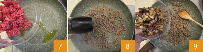 Geben Sie einen Spritzer Öl in eine andere Pfanne und fügen Sie das Fleisch hinzu 7, braten Sie es einige Minuten bei starker Hitze, bis es gut angebraten, aber innen noch weich ist. Dann salzen und pfeffern 8 und die zuvor gebratenen Auberginen hinzufügen, um alles zu würzen 9.