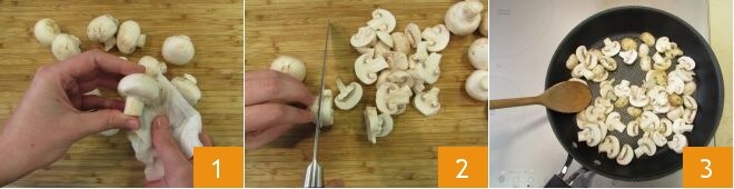 Um das Club-Sandwich mit Rührei zuzubereiten, beginnen Sie mit dem Putzen der Pilze. Nachdem Sie die Wurzel entfernt haben, reinigen Sie sie mit einem feuchten Tuch, um Erdreste zu entfernen 1, dann schneiden Sie sie in 7-8 mm dicke Scheiben 2 und begeben Sie sich zum Herd. In einer Pfanne lassen Sie einen Schuss Öl warm werden und fügen die Pilze hinzu 3,