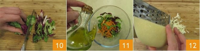 hacken Sie auch die Radicchio- und die Lattichblätter 10 und geben Sie alles in eine Schüssel. Würzen Sie mit Öl und Salz, mischen Sie und stellen Sie sie beiseite 11. Dann reiben Sie den Caciocavallo (zuvor geschält) durch die großen Löcher einer Reibe 12.