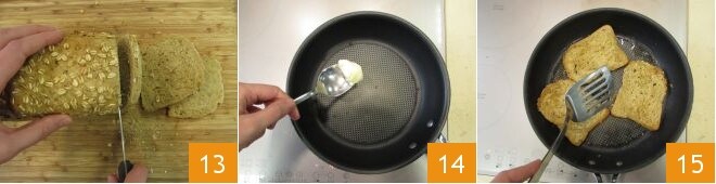 Schließlich schneiden Sie das Brot in 12 etwa 1 cm dicke Scheiben 13. Nun haben Sie alles, was Sie brauchen, begeben Sie sich zum Herd. Erhitzen Sie einen Topf, in dem Sie ein Stück Butter schmelzen lassen 14. Sobald der Boden gut warm ist, legen Sie die Brotscheiben hinein und lassen Sie sie für einige Minuten auf beiden Seiten rösten; wenn sie goldbraun sind, stellen Sie die Brotscheiben beiseite 15.