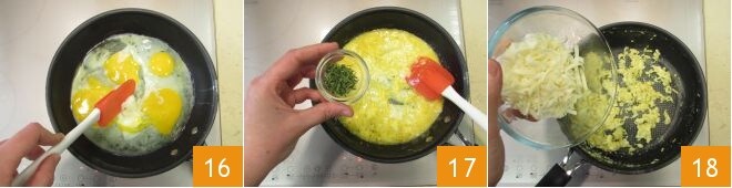 Schlagen Sie die Eier direkt in derselben Pfanne auf und sobald das Eiweiß anfängt zu stocken, brechen Sie es mit einer Spachtel oder einem Holzlöffel 16. Würzen Sie dann mit Salz, Pfeffer und aromatisieren Sie mit Thymian, der von den Zweigen gezupft wurde. Rühren Sie noch für ein paar Minuten weiter, indem Sie kontinuierlich rühren 17. Schalten Sie die Hitze aus und fügen Sie den geriebenen Käse hinzu, rühren Sie kontinuierlich, damit der Caciocavallo schmelzen kann 18.