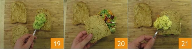 Jetzt geht es an das Zusammensetzen. Streichen Sie etwas Avocadocreme auf die erste Brotscheibe 19, dann einen Löffel Salat 20 und schließen Sie mit der zweiten Scheibe. Auf diese legen Sie etwas Rührei 21