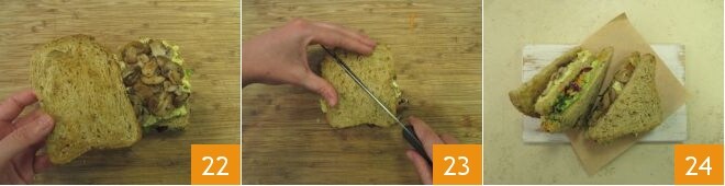 und dann ein paar Pilze 22. Halbieren Sie das Sandwich, um es servierfertig zu machen 23: Ihre Club-Sandwiches mit Rührei sind bereit, guten Appetit 24!