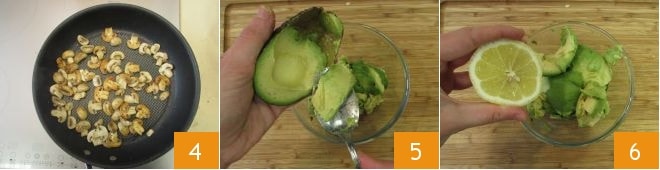 würzen Sie sie sofort mit Salz und braten Sie sie gelegentlich, bis sie goldbraun sind; stellen Sie sie beiseite 4. Machen Sie weiter mit der Avocado, teilen Sie sie in zwei und entfernen Sie den Kern mit einem Löffel. Dann entnehmen Sie das Fruchtfleisch und geben es in eine Schüssel 5, zusammen mit dem Zitronensaft 6,