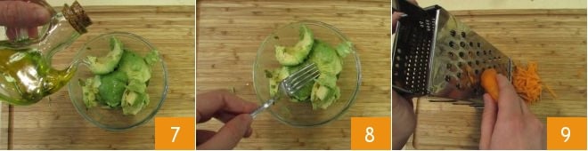 dem Salz und einem Schuss Öl 7 und zerdrücken Sie alles mit einer Gabel zu einem Püree 8. Gehen Sie weiter zum Salat: Schneiden und schälen Sie die Karotten, dann reiben Sie sie 9,