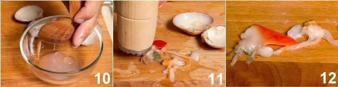 Wenn Sie ihn hingegen gekocht verwenden möchten, sammeln Sie die Flüssigkeit des Weichtieres in einem Schälchen 10, entnehmen Sie die Frucht aus der Schale und legen Sie sie auf ein Schneidebrett. Mit Hilfe eines Fleischhammers wie diesem, weichen Sie das Fleisch des Fasolaro auf, indem Sie auf dem roten Fuß bestehen, bis es dünn, intakt und zart wird (11-12).