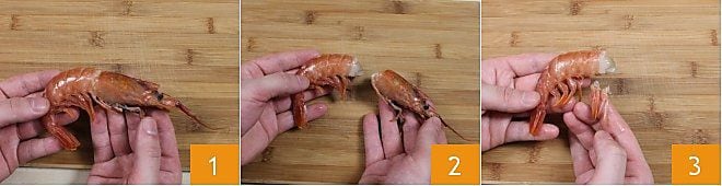 Um Garnelen zu reinigen, spülen Sie sie zuerst unter fließendem Wasser ab, legen Sie sie dann auf ein Schneidebrett und entfernen Sie den Kopf (1-2). Dann entfernen Sie mit den Händen die Beinchen 3