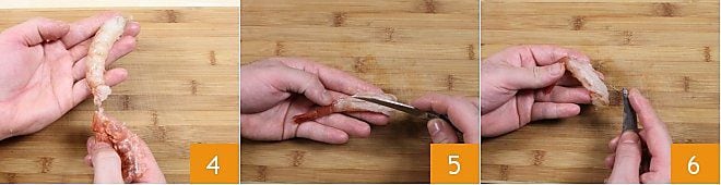 und den Panzer 4, also die Schale, die das Fleisch schützt. Je nach Zubereitungsart können Sie entscheiden, ob Sie das letzte Schwanzstück belassen oder nicht. Sobald sie äußerlich gereinigt sind, gehen Sie zu einem sehr delikaten Schritt über, nämlich dem Entfernen des inneren Darms: Schneiden Sie dazu den Rücken der Garnele mit einem kleinen Messer ein 5 und entfernen Sie den Darm, indem Sie ihn vorsichtig herausziehen 6, ohne ihn zu zerbrechen.