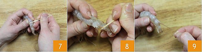 Diese Operation können Sie auch mit einem Zahnstocher durchführen: Stecken Sie ihn in das Garnelenfleisch 7, lokalisieren Sie den Darm und ziehen Sie ihn heraus, um ihn zu entfernen (8-9).