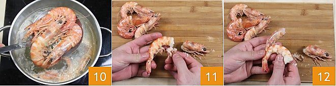 Sie können die Garnelen auch im gekochten Zustand reinigen: Blanchieren Sie sie für ein paar Minuten in kochendem Wasser, lassen Sie sie 4-5 Minuten im Wasser und heben Sie sie dann mit einem Schaumlöffel heraus 10; lassen Sie sie ein paar Minuten abkühlen und reinigen Sie sie dann. Entfernen Sie den Kopf, die Beine und den Panzer (11-12), auch hier können Sie den Schwanz belassen.