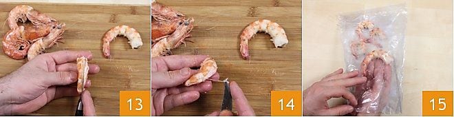 Machen Sie einen Schnitt entlang des Rückens und entfernen Sie den Darm mit einem Zahnstocher oder einem kleinen Messer mit dünner Klinge. Wenn die Garnelen ganz frisch sind, können sie sowohl roh als auch gekocht eingefroren werden (13-14): Im letzteren Fall lassen Sie sie vollständig abkühlen, legen Sie sie dann auf ein Tablett und frieren Sie sie ein 15; wenn sie fest sind, legen Sie sie in Gefrierbeutel und frieren Sie sie ein. Wenn es Zeit ist, sie zu verwenden, tauen Sie sie auf, indem Sie sie am Abend zuvor im Kühlschrank auftauen lassen, und denken Sie daran, sie nur kurz zu kochen, denn sie sind ja schon gegart!