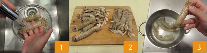 Es gibt verschiedene Methoden, um Canocchie zu reinigen. Je nach Verwendung geht man unterschiedlich vor. Zuerst sollten die lebenden Fangschreckenkrebse unter fließendem Wasser gewaschen werden 1, wobei man darauf achten sollte, sich nicht an den stacheligen Schwänzen zu verletzen. Für die Zubereitung von Pastasaucen oder würzigen Suppen reicht es aus, sie mit einem scharfen Messer in Stücke zu schneiden. Sollten sie im Ganzen gekocht werden 2, muss ein Schnitt entlang des Rückenpanzers gemacht werden, damit das Fleisch beim Kochen besser Geschmack aufnimmt. Alternativ können Sie die Canocchie auch vollständig vom Rückenschild befreien und nur das Fleisch behalten, um Ihren Gästen die Arbeit zu erleichtern oder für spezielle Zubereitungen. In diesem Fall erleichtert es den Vorgang, die Canocchie für 2 Minuten in kochendem Wasser zu blanchieren 3.