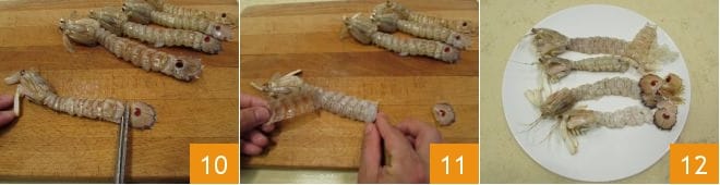 Schneiden Sie auch den Schwanz ab 10, der einige stachelige Auswüchse hat. Mit der rechten Hand halten Sie den Fangschreckenkrebs auf der Arbeitsfläche fest, und mit der linken Hand heben Sie vorsichtig den Rückenpanzer vom Schwanz zum Kopf an 11. So bleibt das gesamte Fleisch frei 12.