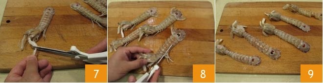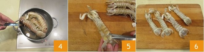 Die Canocchie abtropfen lassen 4 und abkühlen lassen, dann mit einer scharfen Schere die Bauchflossen abschneiden, beginnend von unten 5, und alle entfernen 6.