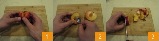 Um die Pflaumen-Ingwer-Konfitüre herzustellen, beginnen Sie mit der Sterilisation der Gläser und Deckel, gemäß den Richtlinien des Bundesministeriums für Gesundheit, die am Ende des Rezepts angegeben sind. Nachdem Sie diesen Schritt durchgeführt haben, wenden Sie sich den Pflaumen zu: Waschen Sie sie, schneiden Sie sie in Hälften 1, entfernen Sie den Kern 2 und schneiden Sie sie dann in Würfel 3.