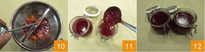 Sobald die Konfitüre gekocht ist, passieren Sie sie durch eine Flotte Lotte, vorzugsweise mit feinem Sieb 10, und füllen Sie sie dann noch heiß in die sterilisierten Gläser 11, wobei Sie darauf achten, 1 Zentimeter vom Rand des Gefäßes frei zu lassen 12. Klopfen Sie die Behälter leicht auf eine Oberfläche, um die Pflaumen-Ingwer-Konfitüre zu setzen. Schließen Sie die Gläser und lassen Sie sie abkühlen. Wenn Sie Gläser mit Gummidichtungsverschlüssen verwenden, können Sie beim Verzehr der Konfitüre den Vakuumtest machen, indem Sie das entsprechende Band ziehen: Wenn es ein trockenes Geräusch macht, bedeutet das, dass der Inhalt korrekt vakuumiert wurde. Andernfalls, wenn das Band „weich“ erscheint, bedeutet das, dass das Vakuum nicht richtig gebildet wurde und der Inhalt besser nicht verzehrt werden sollte. Wenn Sie hingegen Gläser mit Schraubdeckeln verwenden, schrauben Sie die Deckel nach dem Befüllen der heißen Konfitüre gut fest, aber ohne zu fest anzuziehen, und lassen Sie die Gläser abkühlen. Sie können sie umdrehen oder diesen Schritt vermeiden: Durch die Wärme bildet sich dennoch ein Vakuum, das das Produkt lange haltbar macht. Sobald die Gläser abgekühlt sind, prüfen Sie, ob das Vakuum korrekt gebildet wurde: Drücken Sie in die Mitte des Deckels, und wenn Sie kein „Klick-Klack“-Geräusch hören, ist das Vakuum korrekt gebildet. Sobald Sie überprüft haben, dass die Lagerung erfolgreich war, ist Ihre Pflaumen-Ingwer-Konfitüre bereit zum Genießen!