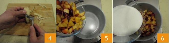Helfen Sie sich mit einem Sparschäler oder einem kleinen Messer und schälen Sie den Ingwer 4. Setzen Sie einen großen Topf auf den Herd und geben Sie die Pflaumen hinein 5. Dann fügen Sie den Zucker hinzu 6.