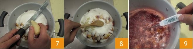 Reiben Sie den Ingwer 7 und mischen Sie mit einem Holzlöffel, um den Zucker gut zu verteilen 8. Rühren Sie gelegentlich und kochen Sie bei mittlerer Hitze für etwa 30 Minuten, bis die Mischung eine Temperatur von 108° erreicht 9.