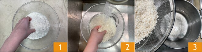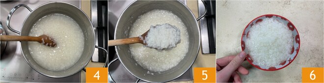 Um den Congee zuzubereiten, beginnen Sie mit dem Klebreis 1, spülen Sie ihn zweimal unter fließendem Wasser ab 2. Geben Sie das Wasser in einen Topf, stellen Sie es auf den Herd und bringen Sie es zum Kochen. Dann fügen Sie den Reis hinzu und lassen ihn bei niedriger Hitze etwa 45-50 Minuten kochen 3