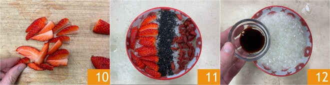 Vervollständigen Sie mit in Scheiben geschnittenen Erdbeeren 10, der süße Congee ist bereit 11. Kümmern Sie sich um die salzige Version: Würzen Sie mit Sojasauce 12.