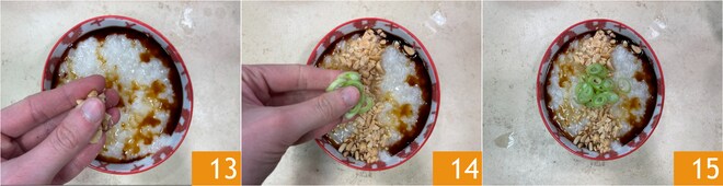 Garnieren Sie mit Erdnusskernen 13 und frischen Frühlingszwiebelringen 14. Auch der salzige Congee ist servierbereit 15.