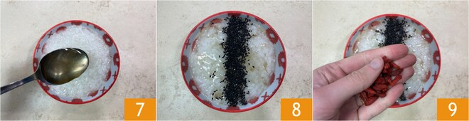In einer Schüssel bereiten Sie den süßen Congee zu: Würzen Sie ihn mit Honig 7, Zucker, schwarzen Sesamsamen 8 und Goji-Beeren 9.
