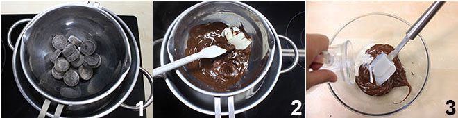 Um den Mascarpone-Becher mit Schokolade und Baisers vorzubereiten, beginnen Sie damit, die Schokolade im Wasserbad zu schmelzen 1 und fügen Sie die Butter hinzu 2. Wenn die Schokolade und die Butter geschmolzen sind, fügen Sie nach und nach die Sahne hinzu, die Sie einige Sekunden in der Mikrowelle oder in einem Topf erhitzt haben 3, und rühren Sie mit einem Spatel, um eine homogene Mischung zu erhalten. Decken Sie die Schokoladencreme mit Frischhaltefolie ab und lassen Sie sie ruhen.