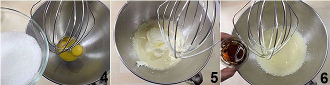In der Zwischenzeit schlagen Sie in einer Küchenmaschine oder mit einem elektrischen Mixer die Eigelbe mit dem Zucker 4 bis eine helle und schaumige Mischung entsteht. Fügen Sie nun den Mascarpone hinzu 5, rühren Sie weiter und fügen Sie schließlich den Marsala hinzu 6.