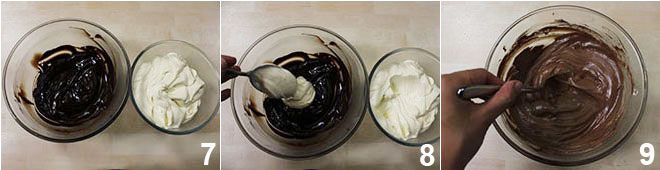Jetzt haben Sie die Schokoladensauce und die Mascarpone-Creme 7: Fügen Sie ein Drittel der Mascarpone-Creme zur Schokoladensauce hinzu 8 und mischen Sie gut, um die Mascarpone-Schokoladen-Creme 9 zu erhalten.