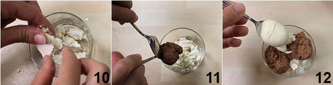 Nun können Sie den Mascarpone-Becher zusammenstellen: Zerbröseln Sie ein paar Baisers (wenn Sie möchten, können Sie sie selbst zubereiten, indem Sie die Anleitung auf unserer Website befolgen: Französisches Baiser) auf den Boden des Glases 10, fügen Sie ein paar Teelöffel der Mascarpone-Schokoladen-Creme hinzu und wechseln Sie sie mit ein paar Teelöffeln der weißen Mascarpone-Creme ab (11-12). Dekorieren Sie mit weiteren Baiser-Stücken und Zartbitter-Schokoladenstückchen: der köstliche Mascarpone-Becher mit Schokolade und Baisers ist bereit, vernascht zu werden!