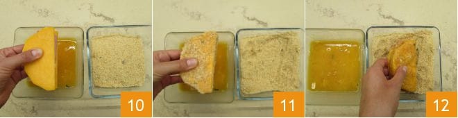 Halten Sie die beiden Kürbisscheiben fest zusammen und tauchen Sie ein Cordon bleu nach dem anderen zuerst in das Ei 10, dann in das Paniermehl, nochmals in das Ei 11 und erneut in das Paniermehl 12. Auf diese Weise erhalten Sie eine doppelte Panierung.
