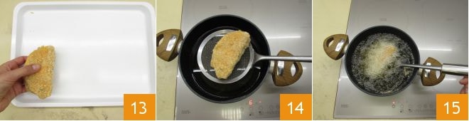 Legen Sie es auf ein Tablett 13 und machen Sie mit den anderen weiter. In der Zwischenzeit erhitzen Sie das Öl, es sollte eine Temperatur von 140°C erreichen. Wenn es die richtige Temperatur erreicht hat, tauchen Sie mit einem Schaumlöffel das erste Cordon bleu in das Öl 14 und braten Sie es etwa 5 Minuten 15,