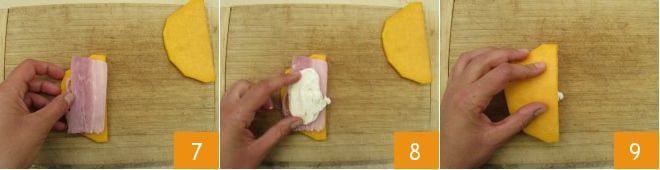 Legen Sie auf eine erste Kürbisscheibe eine halbe Scheibe gekochten Schinken 4 und eine Scheibe Mozzarella 5. Verschließen Sie es mit einer anderen Kürbisscheibe 6. Machen Sie dasselbe mit allen anderen.