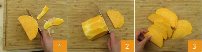 Um die Cordon bleu aus Kürbis vorzubereiten, schälen Sie ihn zuerst 1. Dann schneiden Sie ihn in Scheiben von etwa einem halben cm Dicke 2. Sie sollten 12 Stück davon erhalten 3