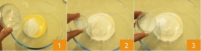 Um die Corn Dogs zuzubereiten, beginnen Sie mit der Zubereitung des Teigs. In einer großen Schüssel gießen Sie das Maismehl und das 00-Mehl 1. Fügen Sie auch das Salz 2 und den Zucker 3 hinzu.