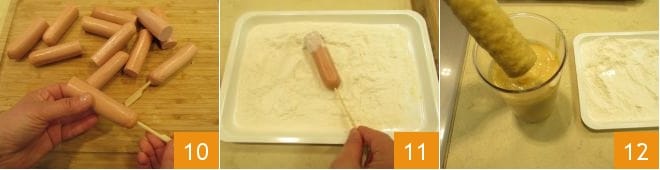 Stecken Sie den ungeschnittenen Teil des Würstchens auf den Spieß 10. Wiederholen Sie den Vorgang für alle Würstchen. Dann wenden Sie sie im Mehl und achten darauf, dass die Oberfläche des Würstchens vollständig bedeckt ist 11, und tauchen Sie es dann in den zuvor vorbereiteten Teig 12. Lassen Sie den überschüssigen Teig leicht abtropfen,